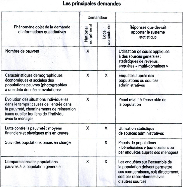 L’esprit général du rapport est, d’abord, de modifier, développer, valoriser, articuler entre elles, les différentes sources existantes, afin de constituer un véritable système statistique, c’est-à-dire un ensemble de sources générales et permanentes, sur les phénomènes de pauvreté et des populations concernées.